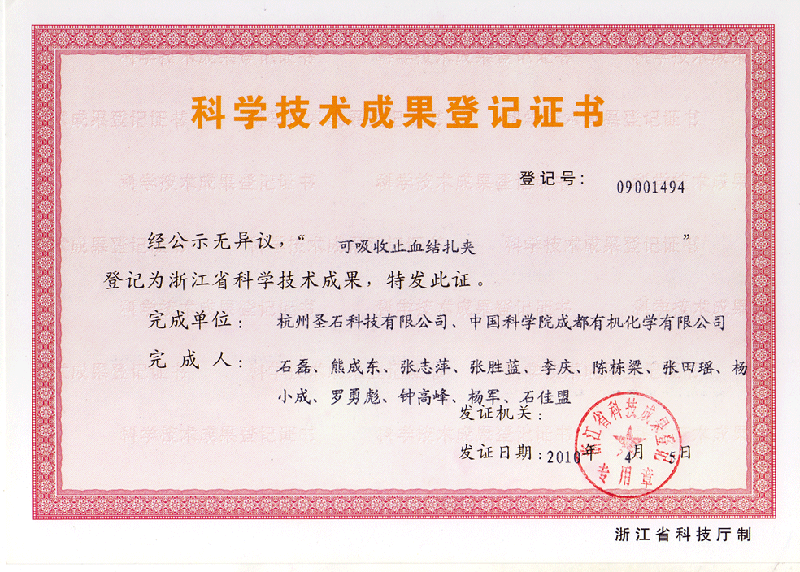 近日,我司研制產(chǎn)品“可吸收止血結(jié)扎夾”獲得浙江省科技廳頒發(fā)的科學(xué)技術(shù)成果登記證書。這一證書的獲得,標(biāo)致著該產(chǎn)品已得到了省級政府部門的認(rèn)可,此舉為我司產(chǎn)品取得更高的榮譽奠定了堅實的基礎(chǔ)。